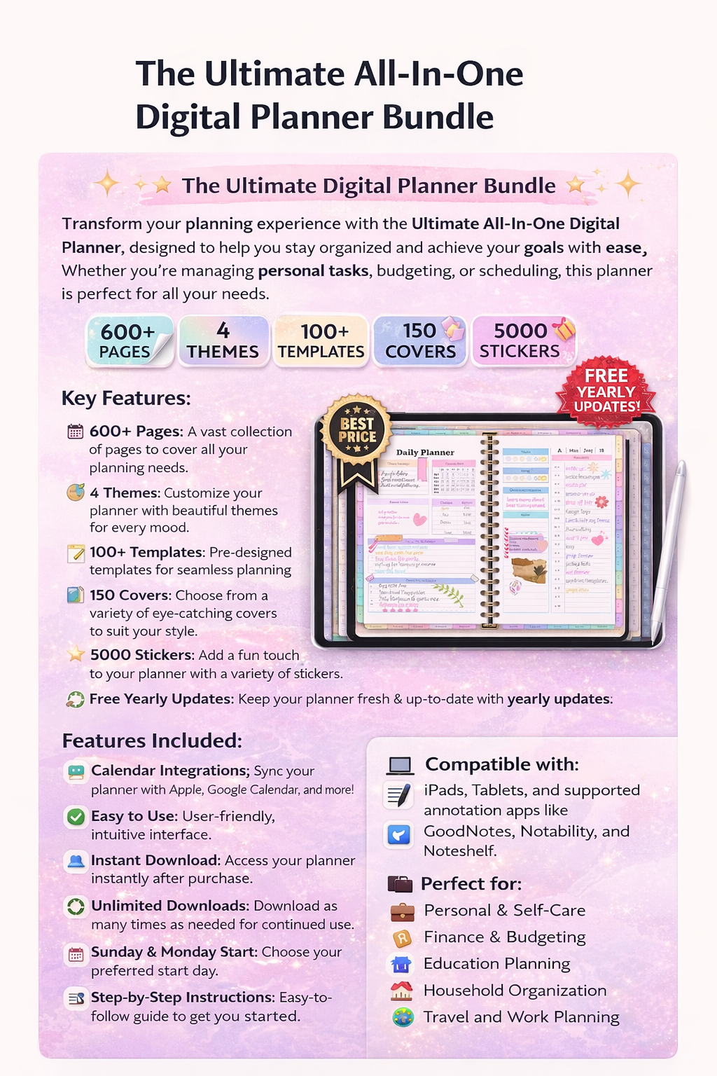 Optimized for GoodNotes, Notability, and Xodo, this planner syncs seamlessly across your Apple and Android devices, ensuring your schedule, finances, and goals are always at your fingertips.